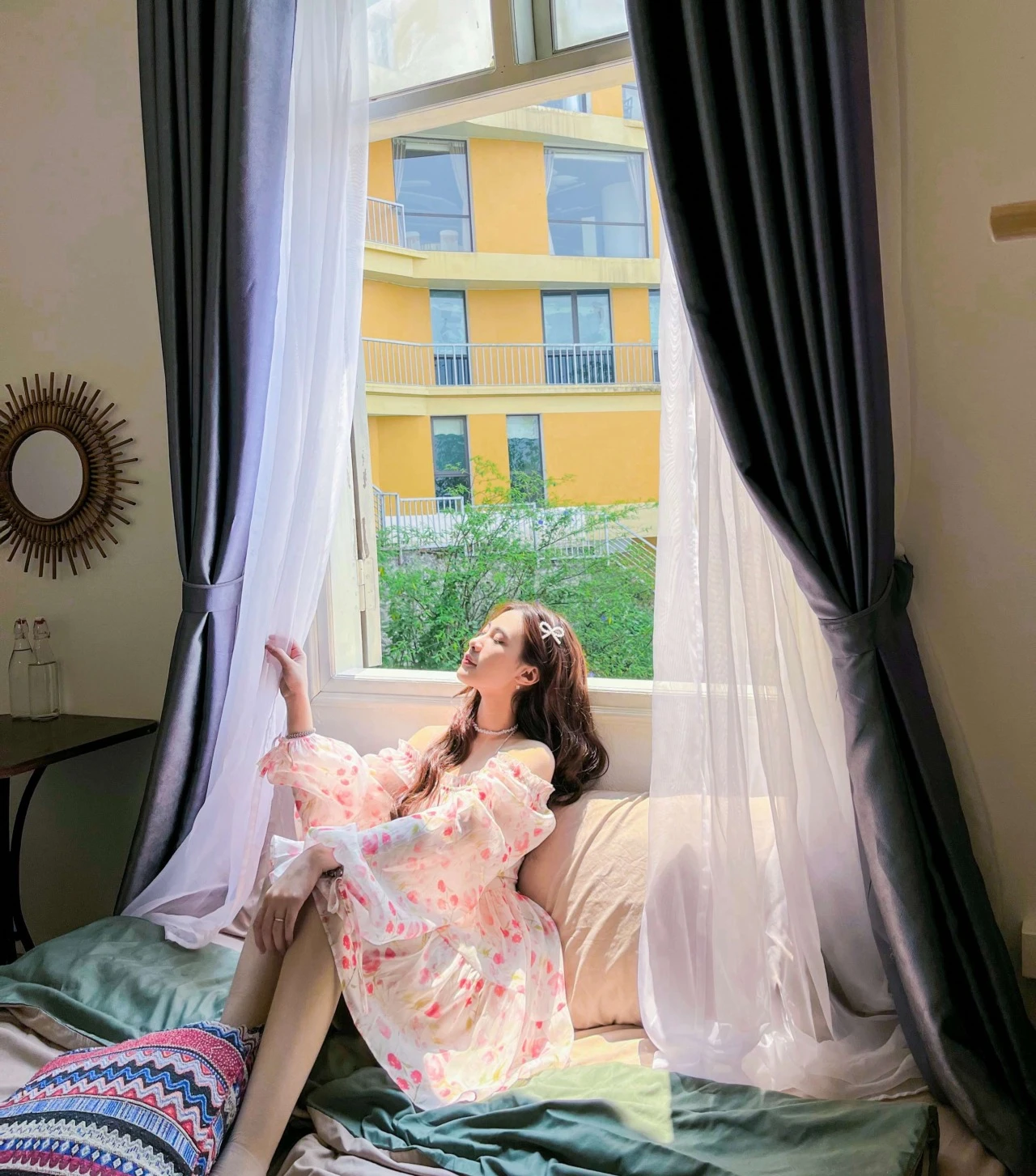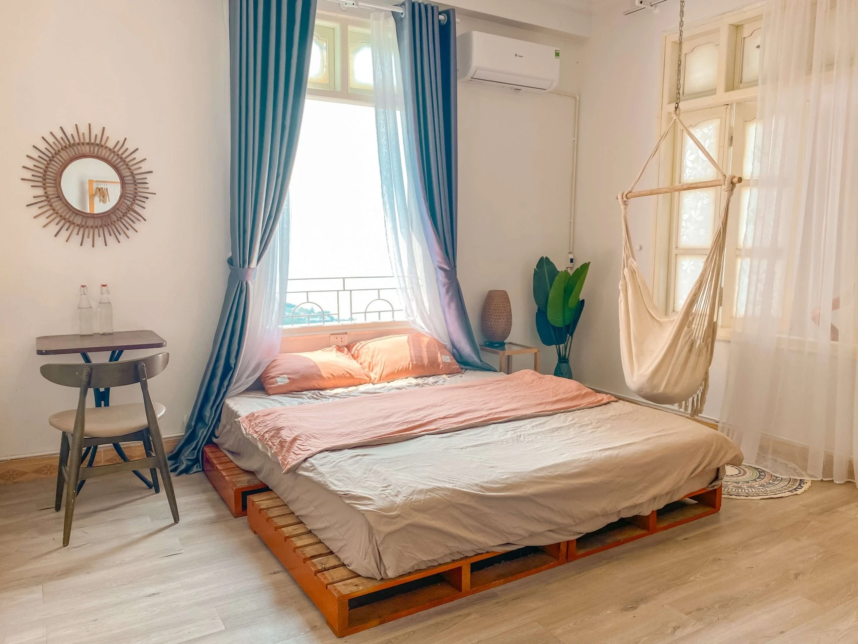 The room with a rustic wooden pallet bed and a unique hanging chair will bring you a truly enjoyable resting experience. Natural light floods through the large windows, combined with simple furniture to create a cozy, intimate space. You can comfortably enjoy peaceful moments by the window, admiring the beautiful natural scenery.