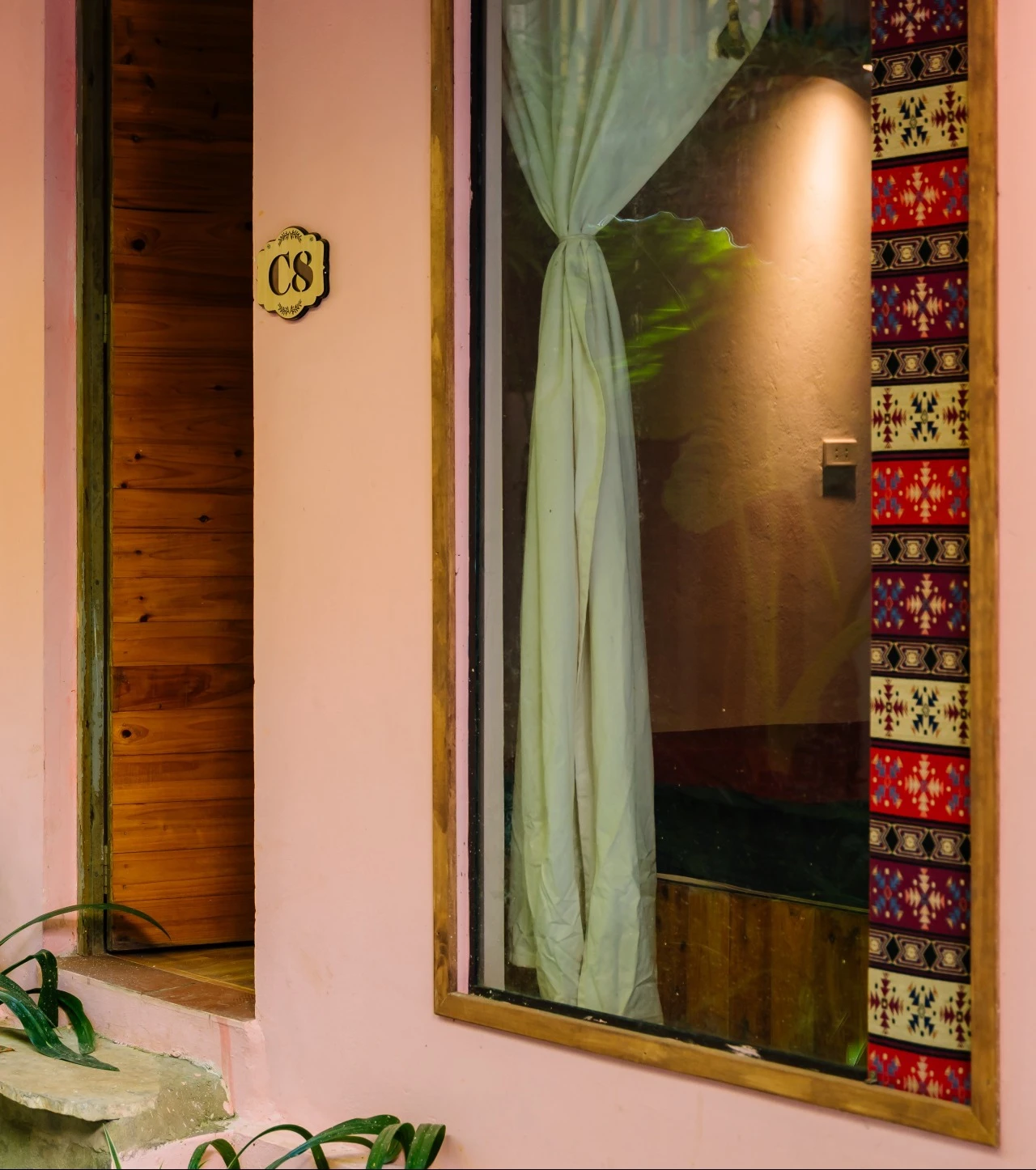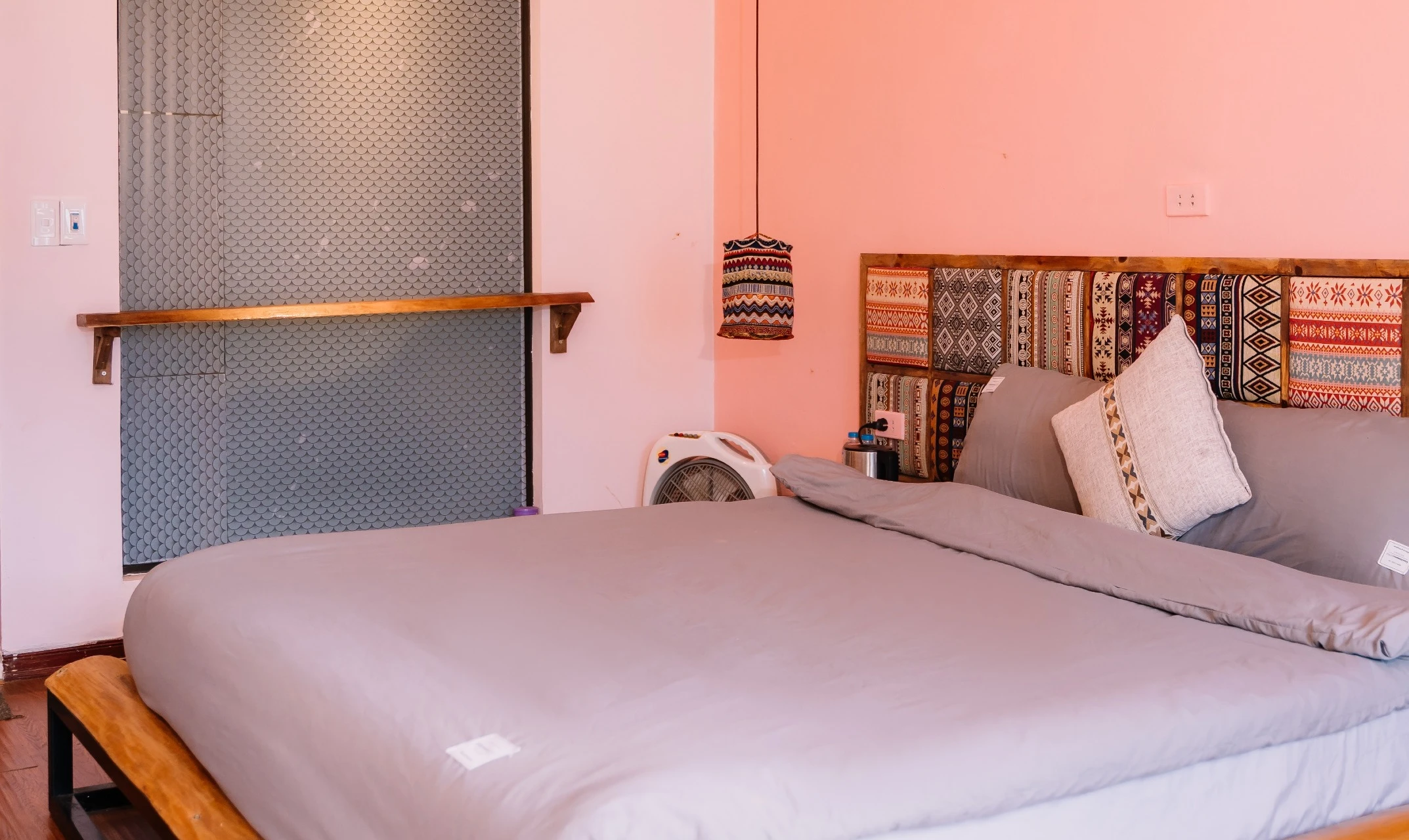 • Thiết kế độc đáo: Sự kết hợp tinh tế giữa tông hồng ấm áp, họa tiết thổ cẩm đặc sắc và trần gỗ mộc mạc tạo nên một không gian vừa hoài cổ, vừa đầy sức sống.