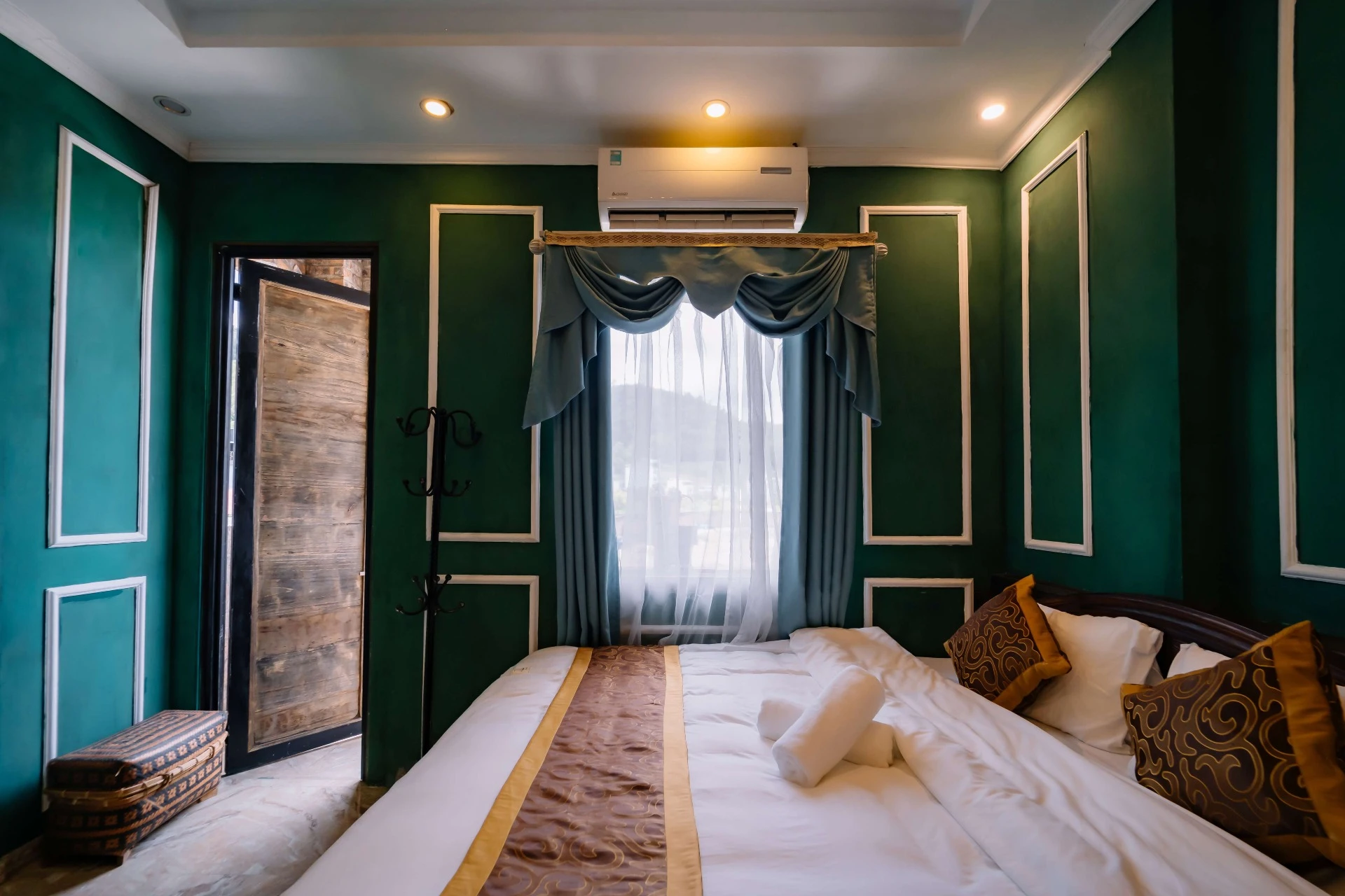 Với thiết kế độc đáo, căn phòng này sẽ mang đến cho bạn những trải nghiệm mới lạ. Gam màu xanh lục đậm tạo nên một không gian sống đầy cá tính, khác biệt. Cửa sổ lớn với khung gỗ và rèm vải nhung